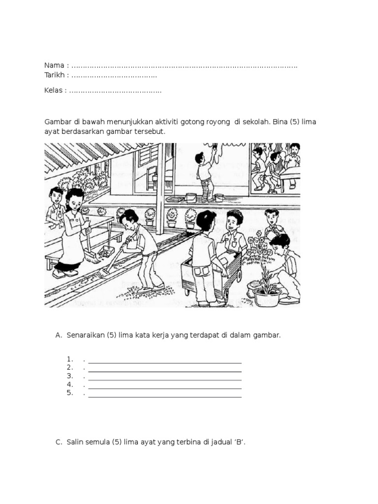 . CONTOH PENULISAN BAHAGIAN A BINA AYAT BERDASARKAN GAMBAR 2. Bina ayat bergotong royong. Contoh bina ayat gotong royong membersihkan contoh.
